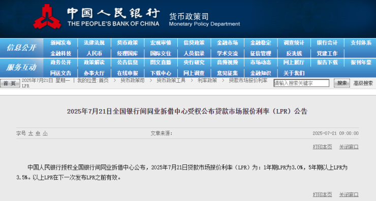 中国人民银行授权全国银行间同业拆借中心公布,2025年7月21日贷款市场报价利率(LPR)为:1年期LPR为3.0%,5年期以上LPR为3.5%。以上LPR在下一次发布LPR之前有效。