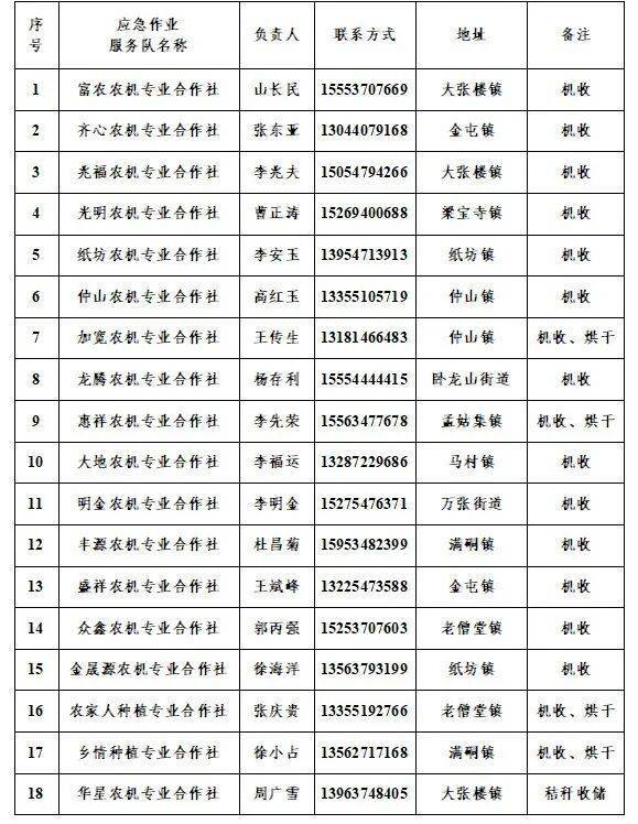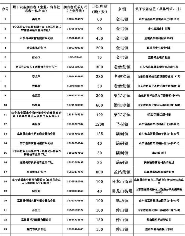 目前,全县正值秋收关键时刻,但连续的阴雨天气给秋粮收割与晾晒储存带来较大困难。为切实做好粮食收获与储存服务,确保秋粮颗粒归仓,现将嘉祥县各镇街的粮食烘干服务点与农机应急作业队联络信息予以公布。请有需要的农民朋友们提前联系,抢抓天气适宜的有利时机尽快收割,并就近选择烘干服务,防止粮食霉变,切实保障粮食品质与收成效益。