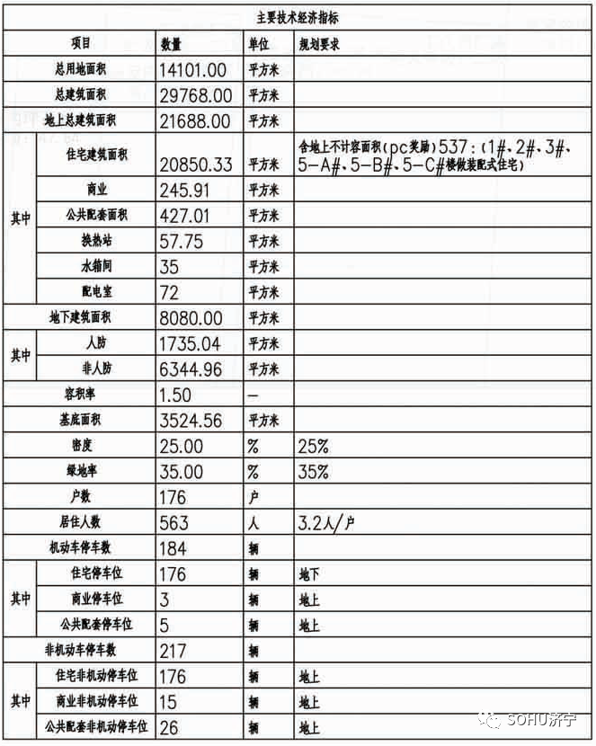 项目规划建设用地面积14101㎡(约21亩);总建筑面积:29768㎡;其中地上建筑面积为21688㎡、地下建筑面积为8080㎡;容积率为1.50;建筑密度25%;绿地率35%;计划居住户(套)数为176户(套),居住人数约563人(按3.2人/户预算);建筑类型包括住宅、商业、养老、公共配套设施等;规划机动车停车位184个,非机动车位217个。