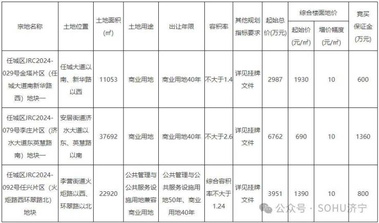 从3宗地块的具体分布上看,均位于任城区。从土地用途来看,2宗商业用地、1宗公共管理与公共服务设施用地兼容商业用地。土地总面积为71665㎡,约107亩;总起始价为13700万元。