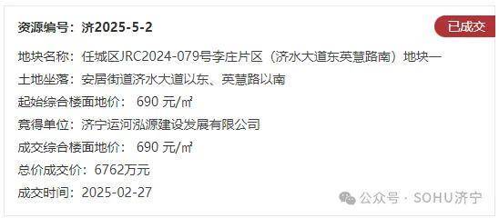 地块二:任城区JRC2024-079号李庄片区(济水大道东英慧路南)地块一【济宁运河泓源建设发展有限公司竞得】