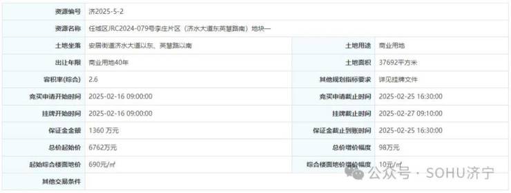 土地位于:任城大道以南、新华路以西;土地面积:11053㎡(约17亩);土地用途:商业用地;出让年限:40年;容积率不大于1.4;起始价:2987万元,综合楼面价起价:1930元/㎡;最终成交价为:2987万元(约176万元/亩),综合楼面地价成交价:1930元/㎡;溢价率:0.0%;