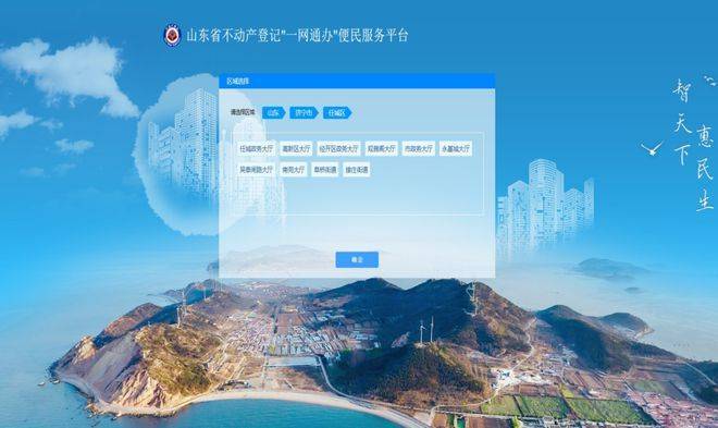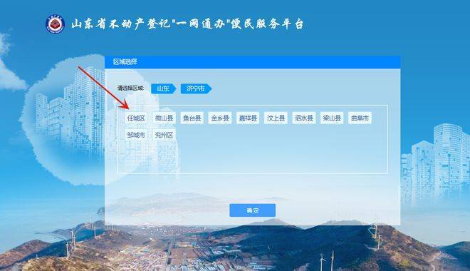 4. 区域选择:山东-济宁市-任城区-选择大厅,点击确定,自动跳转下一步