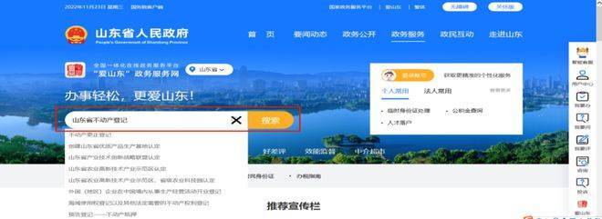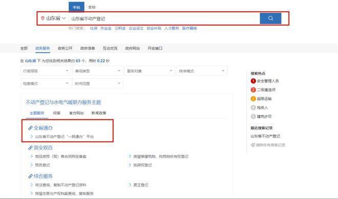 2. 打开后找到页面搜索栏输入“山东省不动产登记”点击搜索,找到全省通办“山东省不动产登记一网通办平台”点击进入