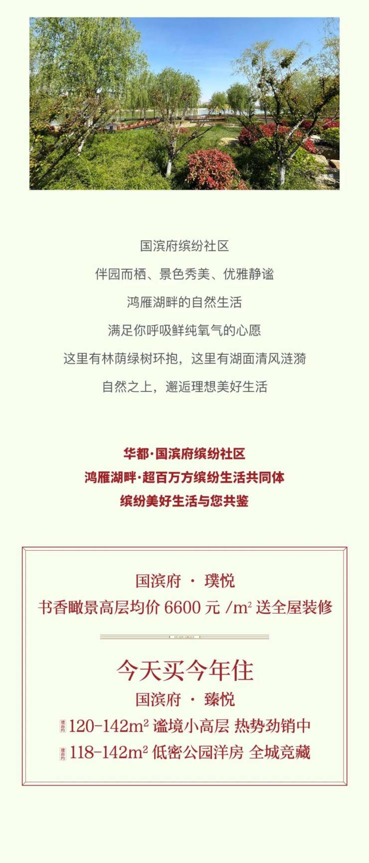 华都国滨府·璞悦缤纷社区伴园而栖、景色秀美、优雅静谧,鸿雁湖畔的自然生活满足你呼吸鲜纯氧气的心愿。这里有林荫绿树环抱,这里有湖面清风涟漪。自然之上,邂逅理想美好生活。