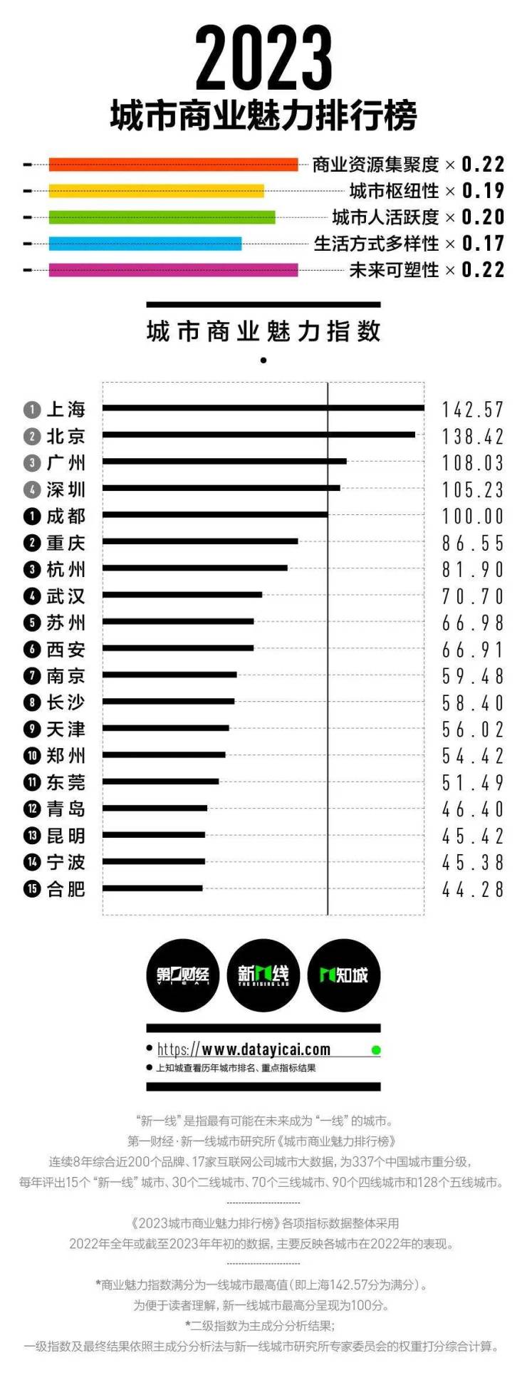 通过近200个品牌、17家互联网公司和数据机构的城市大数据,围绕商业资源集聚度、城市枢纽性、城市人活跃度、生活方式多样性和未来可塑性五大一级维度来评估337座地级及以上城市,2023年这份榜单里的15座新一线城市依次是成都、重庆、杭州、武汉、苏州、西安、南京、长沙、天津、郑州、东莞、青岛、昆明、宁波、合肥。