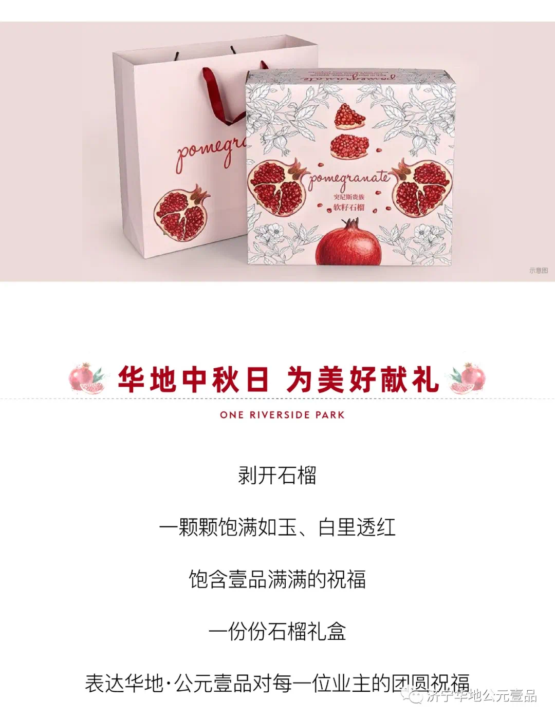 济宁华地公元壹品,为大家带来中秋专享福利。用一份份精美的石榴礼盒,礼遇济宁华地公元壹品各位业主。业主们仅需来访售楼部即可领取。