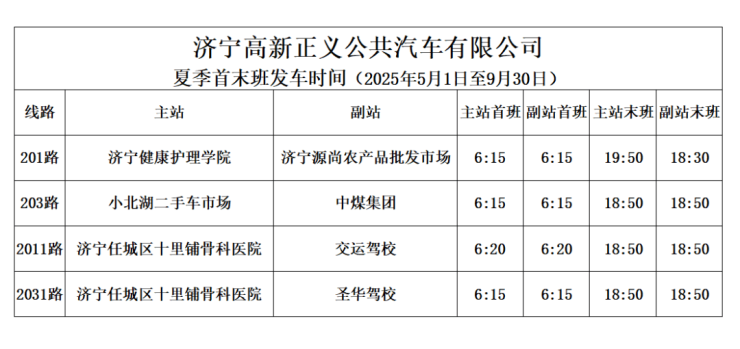 合往年客流出行特点,2025年5月1日至2025年9月30日,济宁高新正义公共汽车有限公司所有公交线路执行夏季运营时间,特提醒广大市民注意,合理安排出行时间。