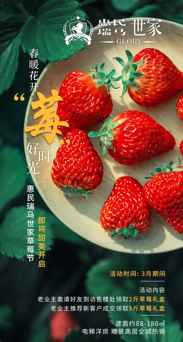 即日起老业主邀请新客户到访售楼处看房即可领取2斤草莓礼盒老业主推荐新客户成交即可领取5斤草莓礼盒数量有限,先到先得好啦好啦,话不多说时间赶紧安排!!日程安排活动时间:2021年3月活动地点:惠民瑞马世家售楼中心