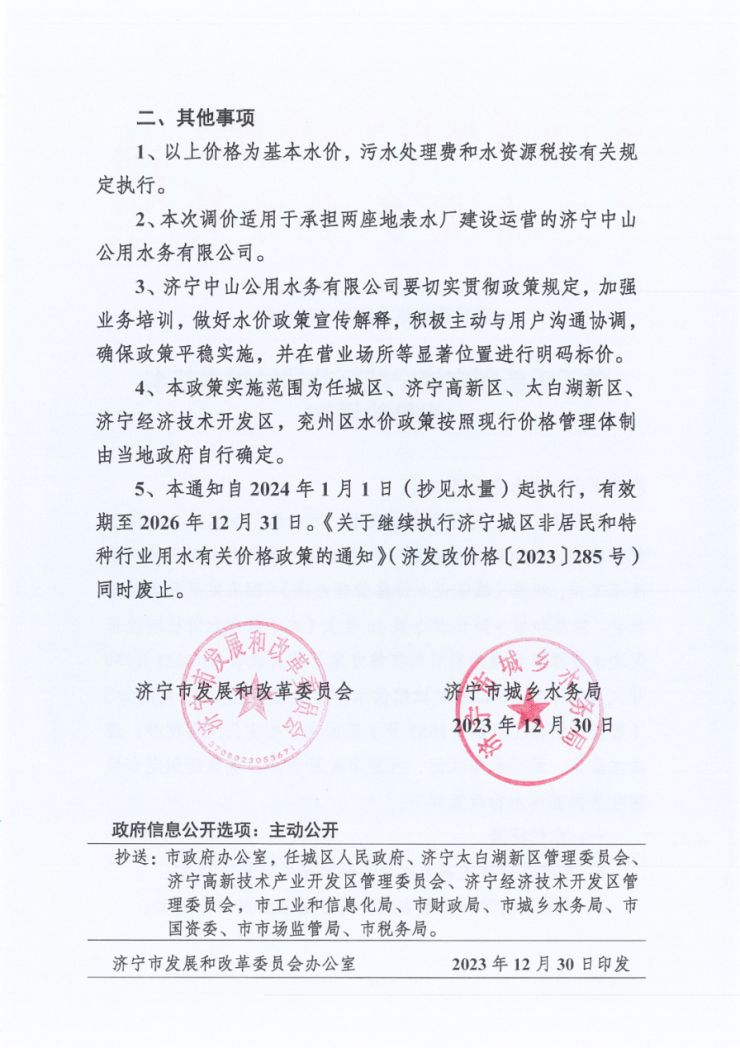 2、济宁中山公用水务有限公司要切实贯彻政策规定,加强业务培训,做好水价政策宣传解释,积极主动与用户沟通协调,确保政策平稳实施,并在营业场所等显著位置进行明码标价。