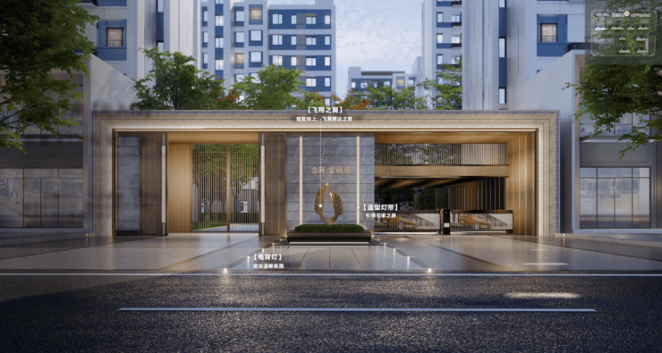 循迹府门,入口即见仪式之感,定制「飞翔之翼」雕塑,居府门正中,左右辅以造型灯带,寓意奋发向上、飞黄腾达。