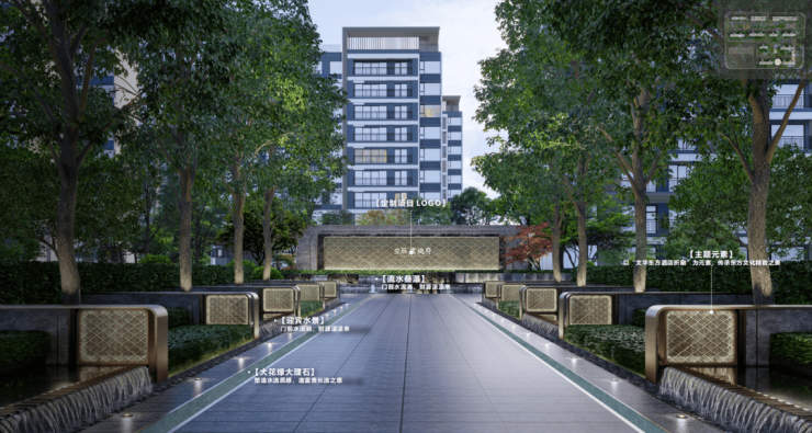 迈入大门如步入画中。凭栏远眺,观运河之景;信步闲庭,享东方繁华。蓝调国际为雲樾府打造的前庭:超长城市界面,花绿大理石与流水相映,流水叠瀑潺潺而来,富有仪式感的入口,将一卷美妙的画轴掩映在绿意中,光影与水辉映,透着济北运河气韵。
