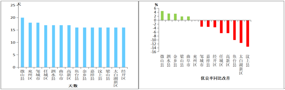优良天最多的县(市、区)是微山县,为20天;最少的是鱼台县、金乡县、嘉祥县、汶上县、梁山县、太白湖新区、经开区,均为16天;14县(市、区)同比改善幅度较大的是微山县,为提高4.6个百分点,最小的是汶上县,为减少13.4个百分点。