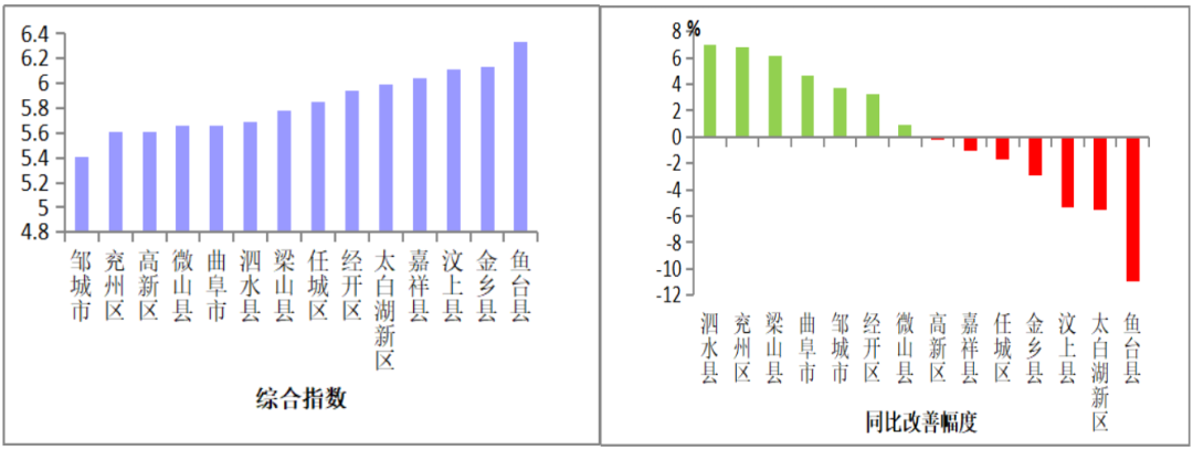 环境空气质量综合指数较好的县(市、区)是邹城市,为5.41;最差的是鱼台县,为6.33;14县(市、区)同比改善幅度较大的是泗水县,改善幅度为7%,最小的是鱼台县,为恶化10.9%。