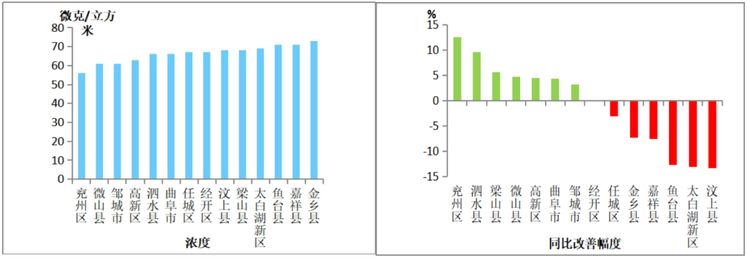 细颗粒物(PM2.5)浓度较低的县(市、区)是兖州区,为56微克/立方米;较高的是金乡县,为73微克/立方米;14县(市、区)同比改善幅度较大的是兖州区,改善幅度为12.5%,最小的是汶上县,为恶化13.3%。