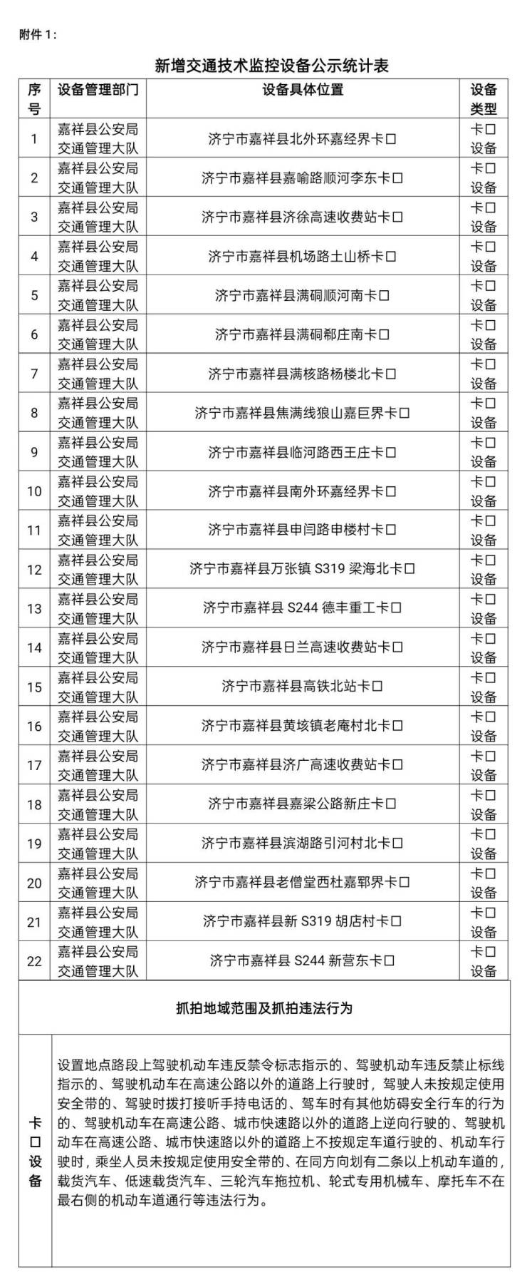 为加强道路交通管理,规范道路交通秩序,创建有序、安全、畅通的道路交通环境,预防和减少交通事故,保护公民人身、财产安全。嘉祥县公安局交通管理大队新增22处交通技术监控设备,现对以下设备予以公示。