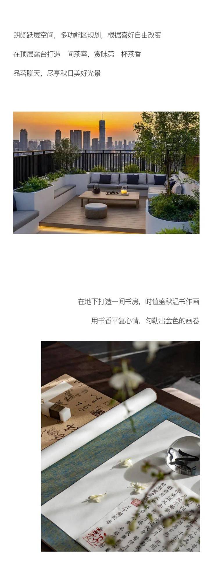 中垠·和悦府约125/140㎡跃层洋房,奢阔双层空间首层以日常、共享的居家生活为主,巨幕客厅视野贯通,舒适感加倍提升。朗阔跃层空间,多功能区规划,根据喜好自由改变在顶层露台打造一间茶室,赏味第一杯茶香品茗聊天,尽享秋日美好光景。
