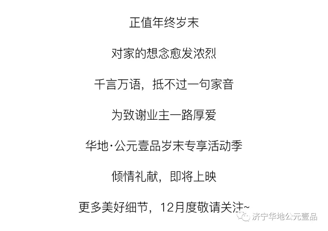 正值年终岁末,对家的想念愈发浓烈。千言万语,抵不过一句家音。为致谢业主一路厚爱,济宁华地公元壹品岁末专享活动季。倾情献礼,即将上映。更多美好细节,12月度敬请关注。