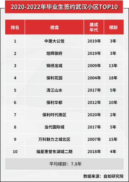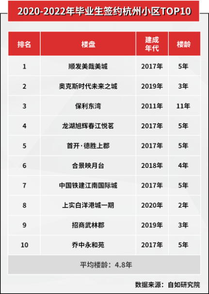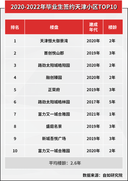 而新一线城市的毕业生们则展现了与一线毕业生不一样的聚集形态,他们更集中的居住在城市的高新区里,偏好的小区也更为年轻,在天津,毕业生们签约的top10小区楼龄仅为2.6年。