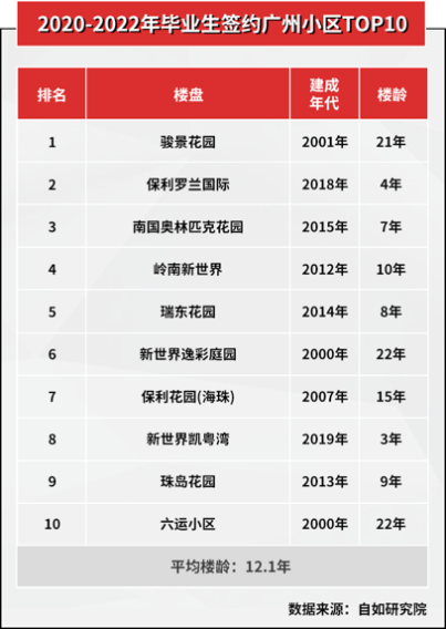 深圳也是毕业生签约top10小区平均楼龄最长的城市,前10小区的平均楼龄为17.3年。而紧随其后的是北京、广州、上海三个城市,前10小区的平均楼龄为12.7年、12.1年与9.8年。