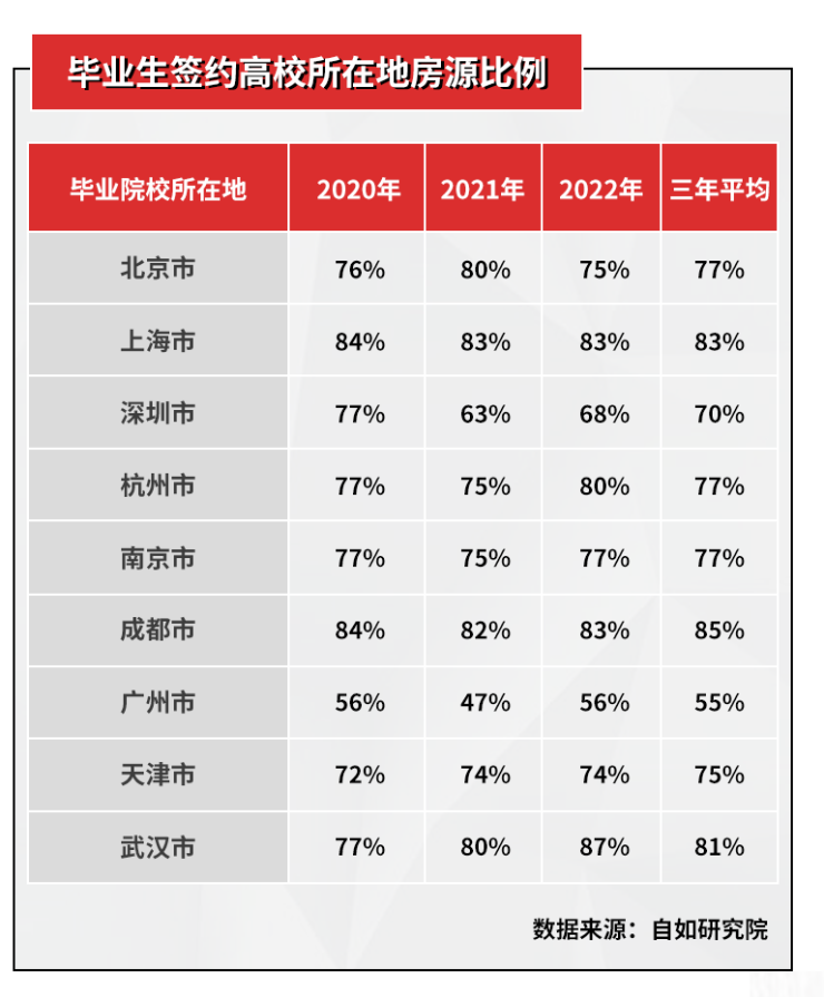 综合三年来看,在全国9个重点城市中,有78%毕业生留在高校所在地租房,且每个城市的比例均逐年递增。也就是说,在你选择学校的时候,大概率就选择了你会在哪里奋斗;
