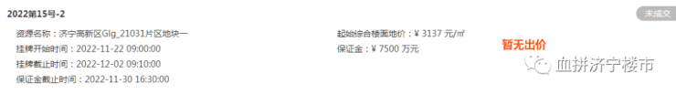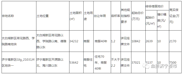 土地位于:济宁高新区开源路以北、海川路以东;土地面积:53642㎡(约80.5亩);土地用途:商住用地;出让年限:商业40年、住宅70年;容积率不大于2.2;起始价:37021万元,综合楼面价起价:3137元/㎡;因无竞买方出价,本地块流拍。