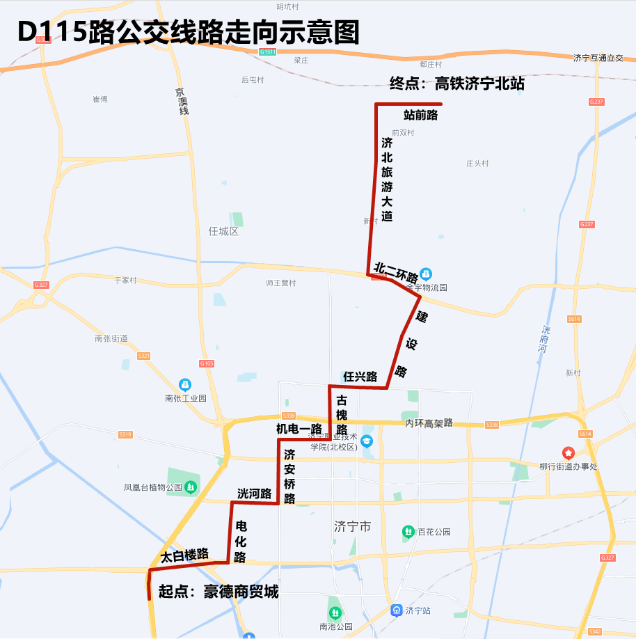 途经站点:豪德商贸城—电化路太白楼路—西刘村—永康医院(开泰花园)—九九花园—长安花园—济北贸易市场—仁诚雅居—人文嘉园—晨阳庄园—任兴路古槐路—五里屯农贸市场—苗木协会—百帝漆业—高铁济宁北站