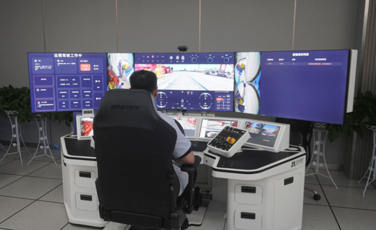 在龙拱河与京杭大运河的交汇处,位于济宁市任城区的龙拱港呈现一片繁忙景象。无人水平运输车装载着集装箱驶向码头,自动吊装设备将集装箱稳稳安置在货船上,而操作员只需坐在控制室内,在屏幕前利用操纵手杆和监控系统进行远程操控。