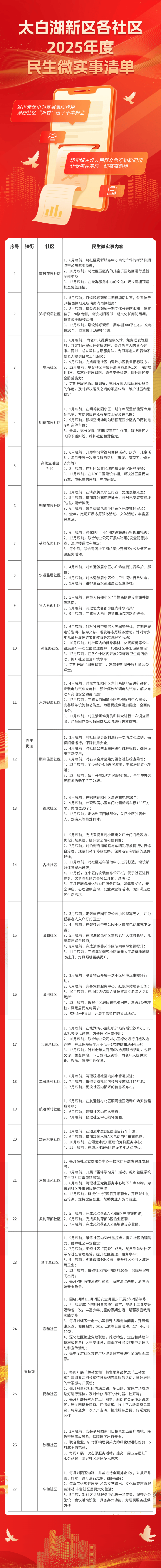 为全面激发社区“两委”班子担当作为新活力,不断增强组织凝聚力和队伍向心力,提升基层治理效能,太白湖新区所辖各社区坚持问题导向与目标导向相结合,立足本社区实际,聚焦群众需求,制定2025年度“民生微实事”项目清单,着力破解群众反映集中的痛点难点问题。通过实施民生微实事项目,推动基层党建与社区治理深度融合,持续放大党建引领效应,使党旗始终飘扬在服务群众最前沿。现将太白湖新区各社区2025年度民生微实事清单刊发如下。