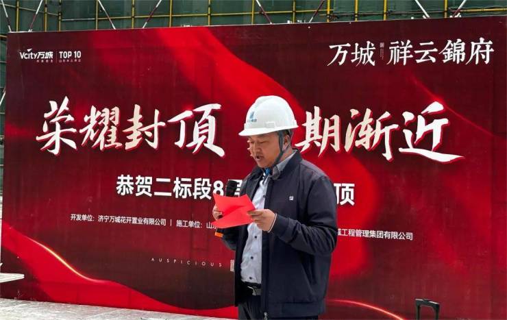 封顶仪式上,济宁事业部副总经理陈飞代表集团致辞,他表示,本着集团“凭良心、建房子、做品质、当标杆”的理念,项目始终以专注持久的匠心,打造安全放心工程,保障交付品质,为广大业主交付一份满意的答卷。8号楼的顺利封顶,离不开各参建方的精诚协作和不懈努力。封顶仪式是鉴证,亦是荣耀,这不仅是奋战在一线全体员工的功劳,也是万城集团品牌实力的见证。