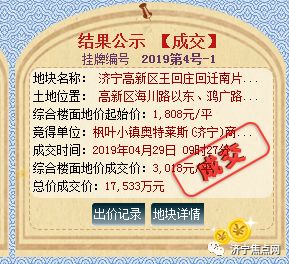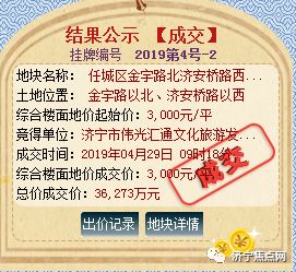济宁搜狐焦点房产网小编今日从济宁市自然资源和规划局获悉:济宁市自然资源和规划局以网上挂牌方式出让高新区、任城区2宗国有建设用地使用权,均为商住用地,总起始价46777万,总计122054㎡,约183亩。经竞价后,最终成交价格为53806万。