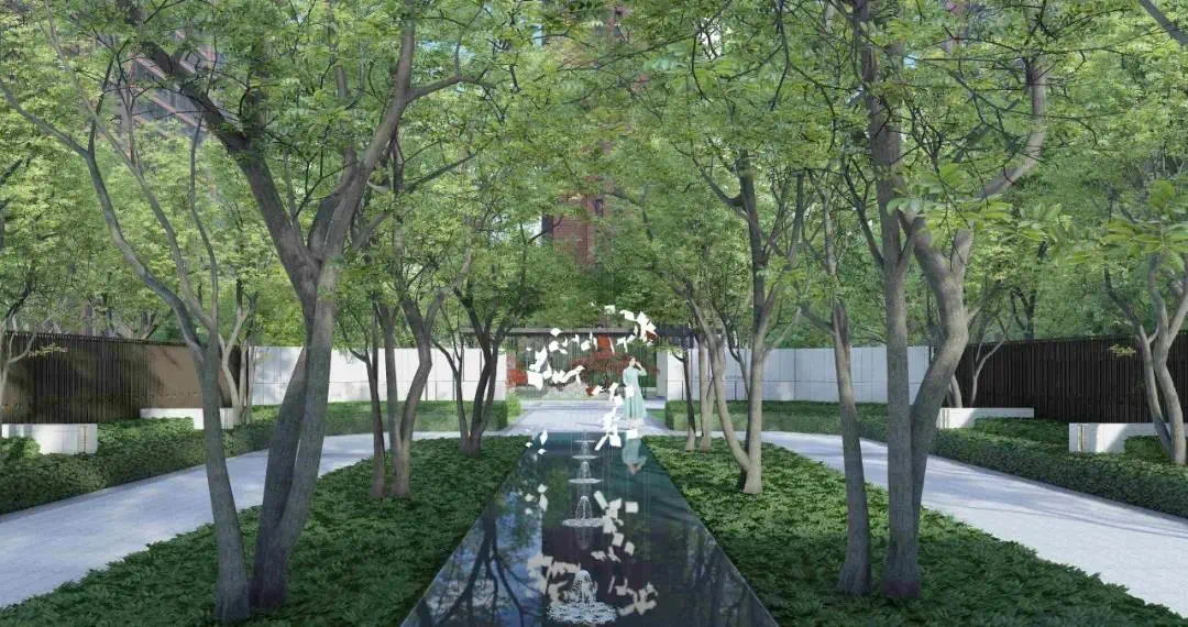 超高绿化,园林生活。36%超高绿化率,以曲线形式将滨水的元素引入小区环境,让人在其中行走居住更加舒适自然。以黑白绿为主要环境基调,红色点缀其间,与建筑相互映衬。