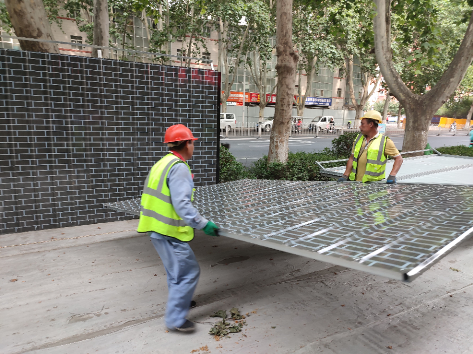 6月28日,记者在建设路观察到,该路段从南边的车站西路到北边的太白楼中路进行了不同程度的围挡封闭,并在封闭路段前摆放提示绕行牌。同时,在该路段主车道两侧新铺设的临时便道已经完工。
