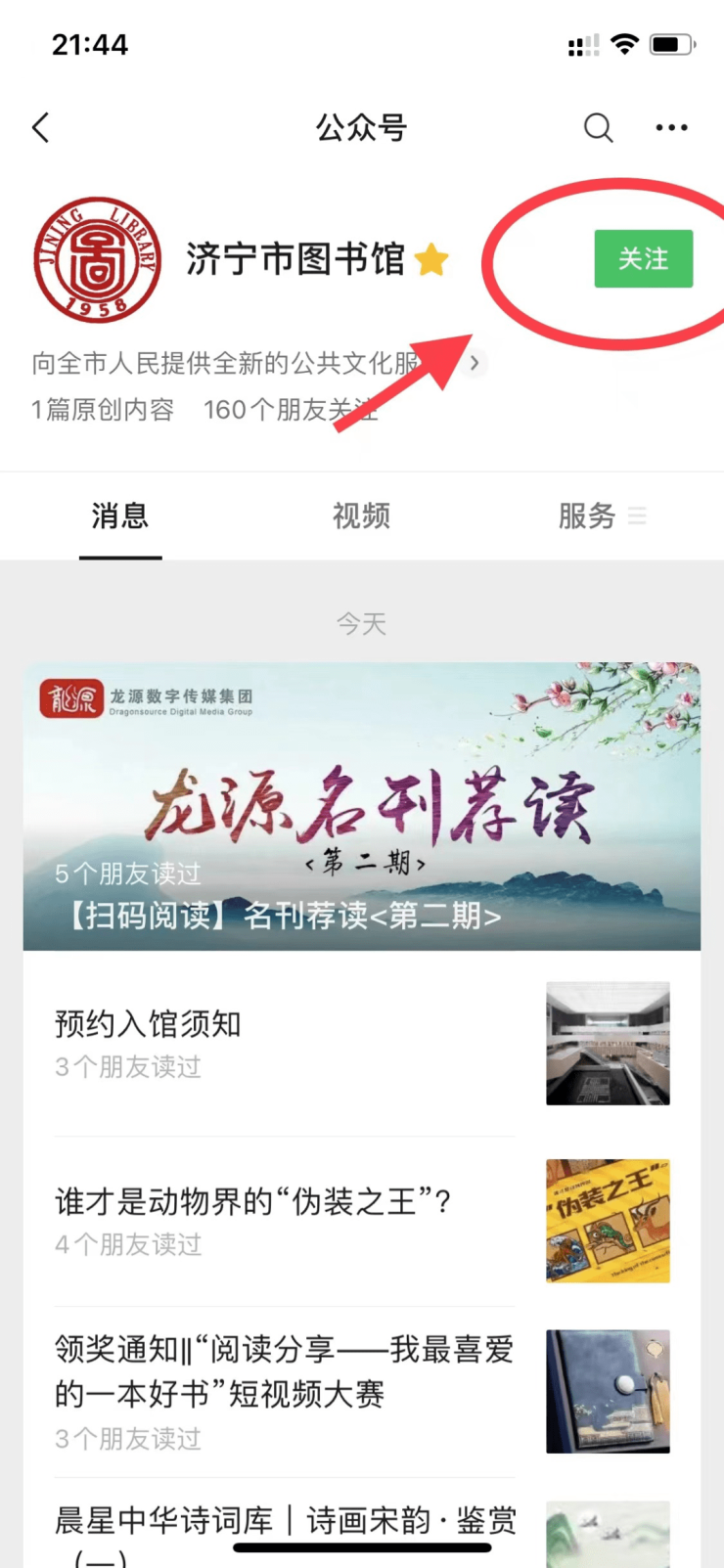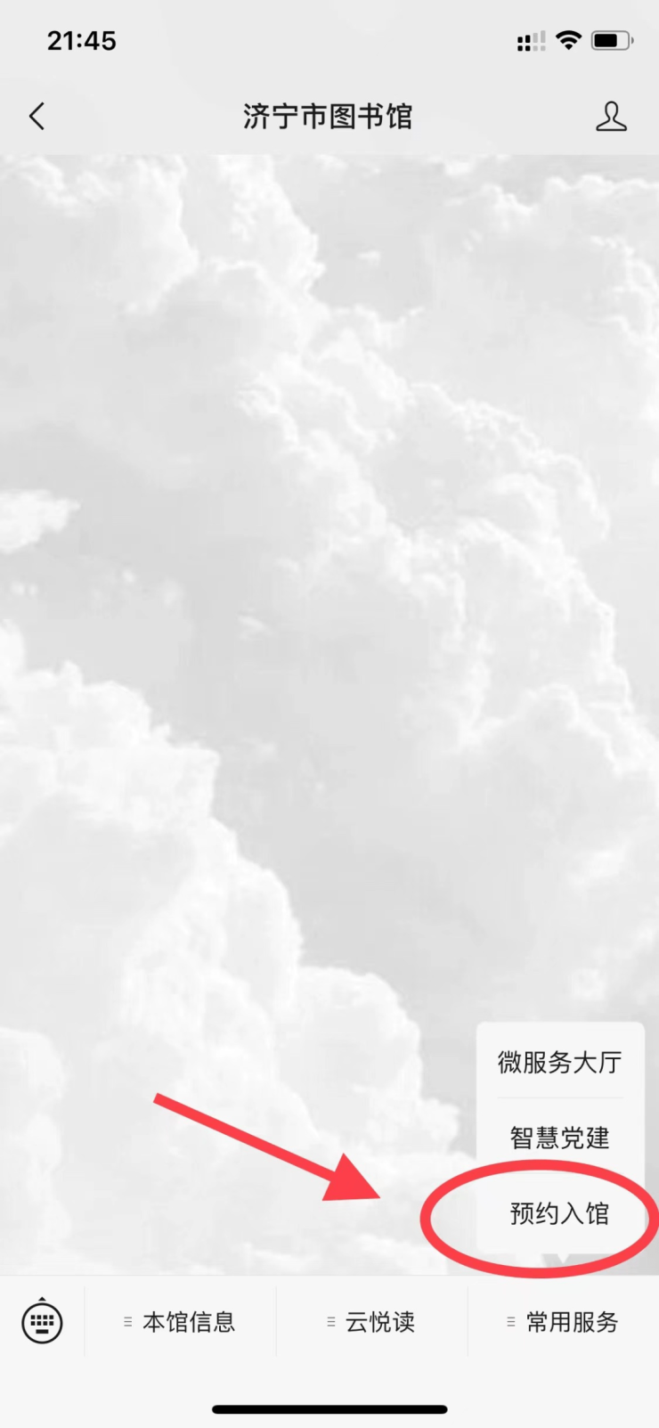 关注“济宁市图书馆”微信公众号→“常用服务”菜单→“预约入馆”菜单,进入预约页面。