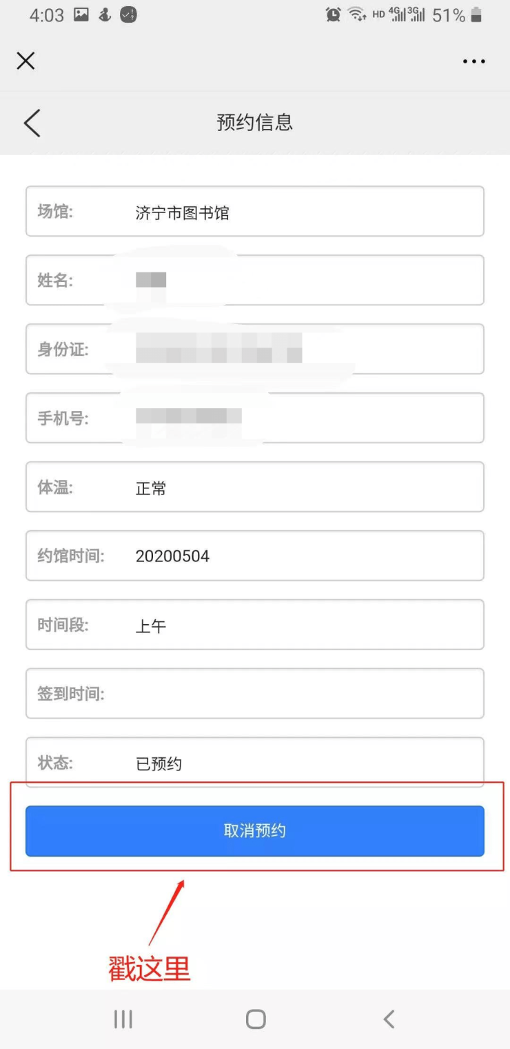 2.“取消预约”:预约成功后,可再次进入预约系统首页,在右下角“我的”里可查看自己的预约信息;如发现有预约错误或者预约后无法到馆,可在“我的”里查找到已经预约的信息进行取消操作。(具体操作见下图)