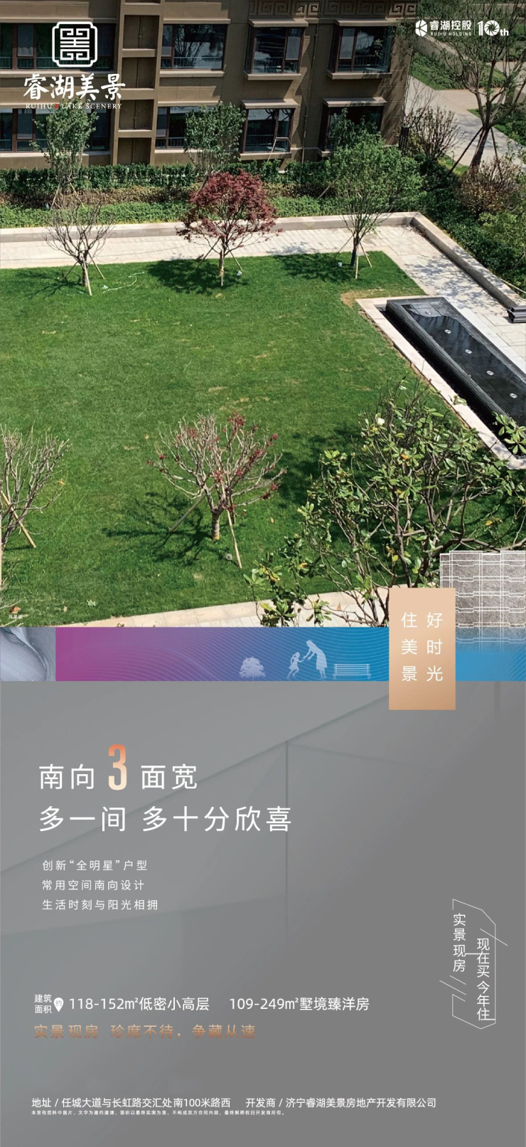 睿湖美景南向3面宽,多一间,多十分欣喜。创新“全明星”户型,常用空间南向设计,生活时刻与阳光相拥。建筑面积约118-152㎡低密小高层,109-249㎡墅境臻洋房。实景现,房珍席不待,争藏从速。