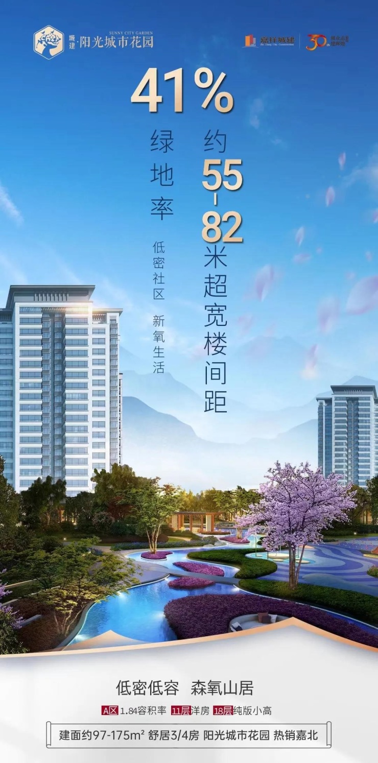 阳光城市花园41%绿地率,约55-82米超宽楼间距。低密社区,新氧生活。A区1.84容积率,11层洋房,18层纯版小高。建面约97-175㎡舒居3/4房,阳光城市花园,热销嘉北。