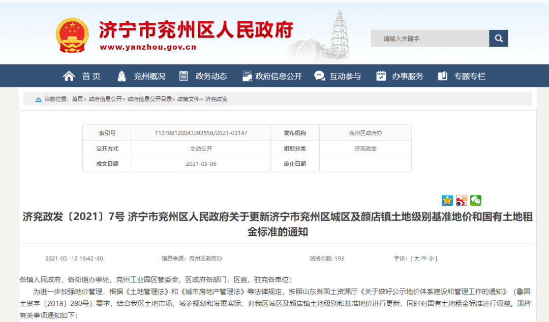 近日,兖州区人民政府网站公开了济兖政发〔2021〕7号 济宁市兖州区人民政府关于更新济宁市兖州区城区及颜店镇土地级别基准地价和国有土地租金标准的通知。