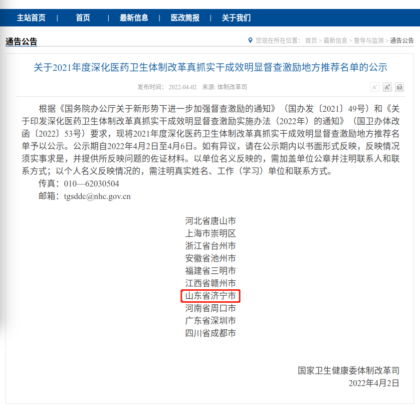 近日,国家卫生健康委对2021年度深化医药卫生体制改革真抓实干成效明显督查激励地方推荐名单进行了公示,济宁市是全国10个入选推荐名单的城市之一。