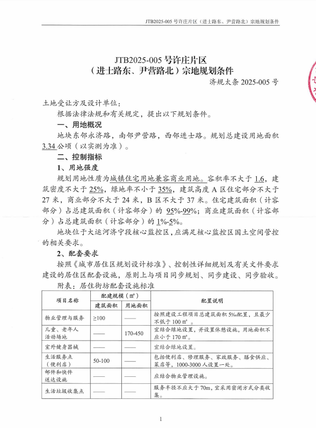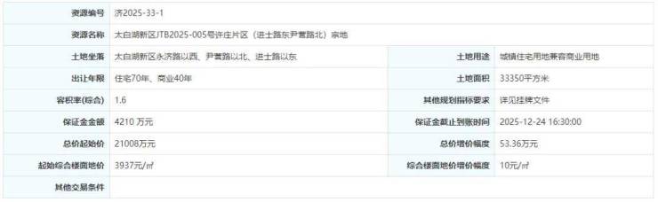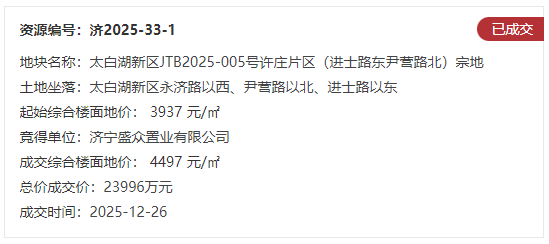 地块名:太白湖新区JTB2025-005号许庄片区(进士路东尹营路北)宗地【济宁盛众置业有限公司竞得】