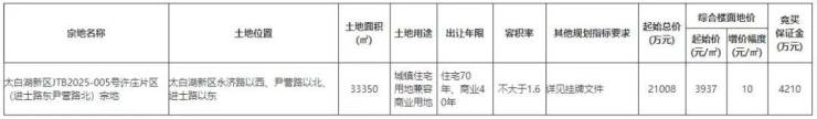 从该宗地块的具体分布上看,位于太白湖新区。从土地用途来看,为城镇住宅用地兼容商业用地。土地面积为33350㎡,约50亩;起始价为21008万元。