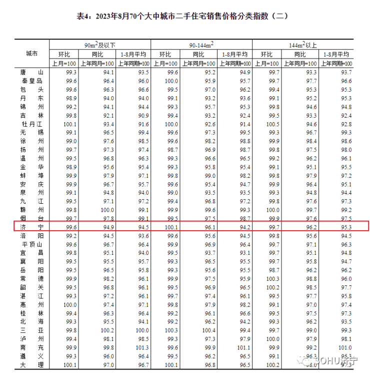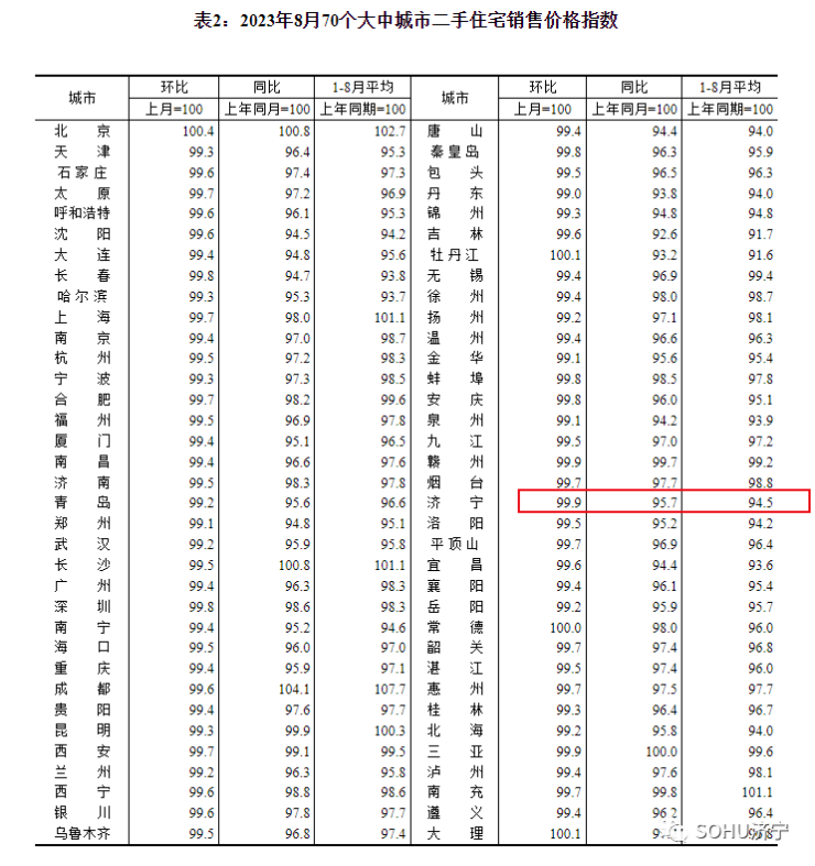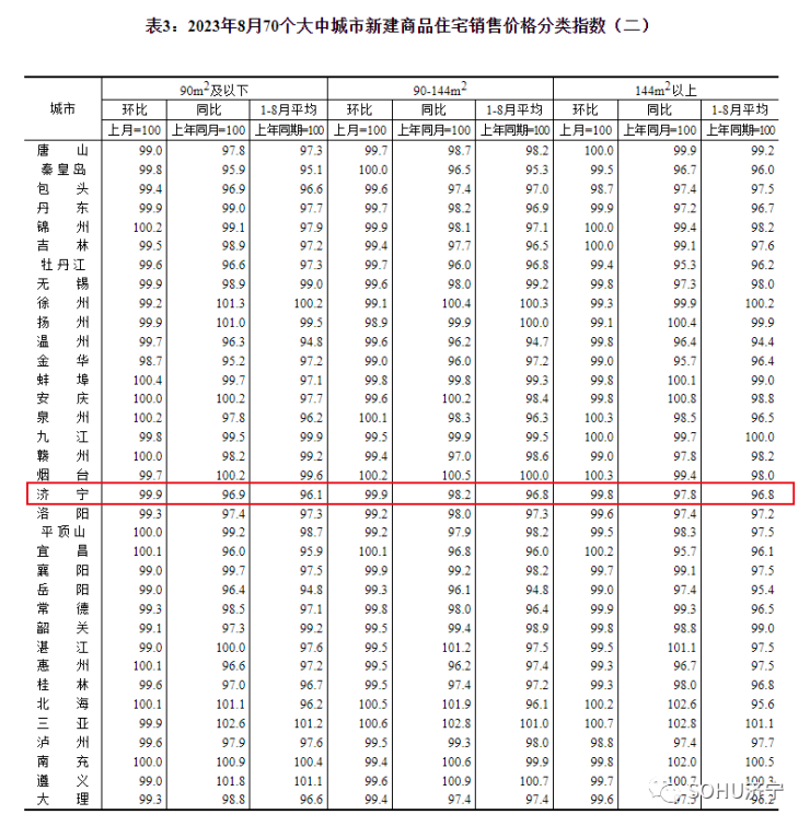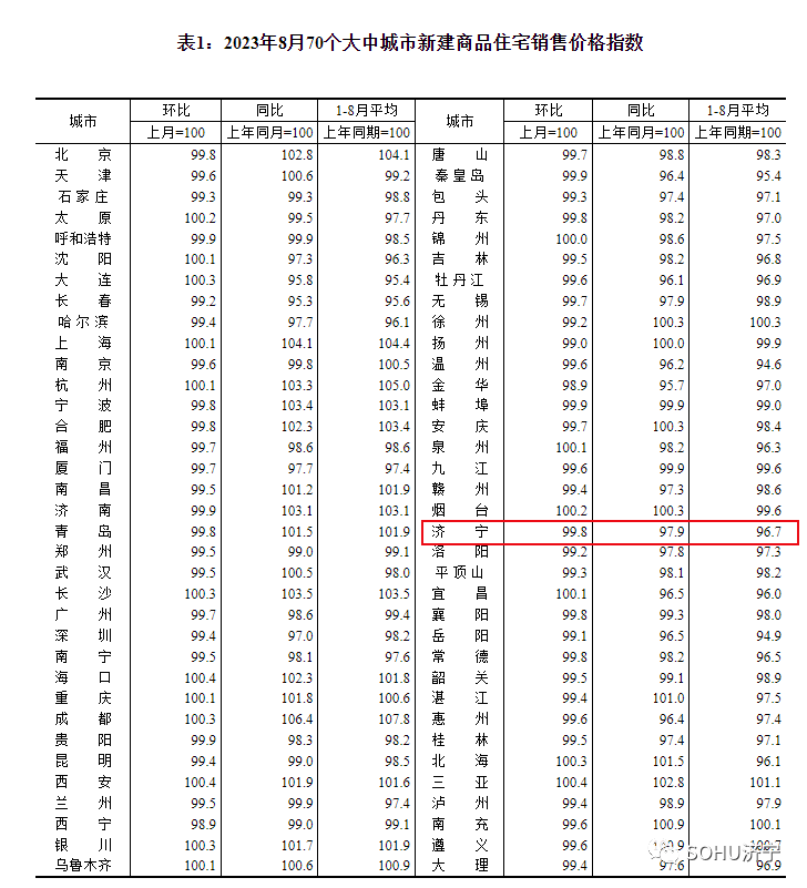 搜狐网济宁小编注意到:今早9点30分,国家统计局发布了2023年8月份70个大中城市商品住宅销售价格变动情况统计数据。2023年8月份济宁新建商品住宅销售价格环比下降0.2个百分点。