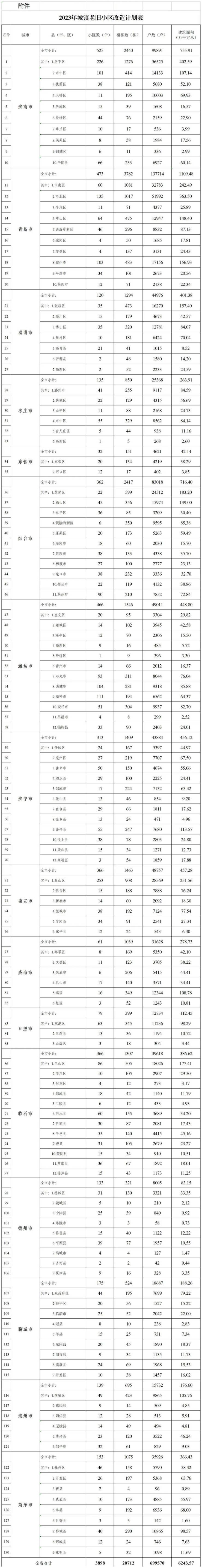 近日,山东省住房和城乡建设厅公布了16市2023年城镇老旧小区改造计划,全省共计划改造老旧小区3898个,涉及居民69.95万户、楼栋数20712个,改造面积6243.57万平方米。