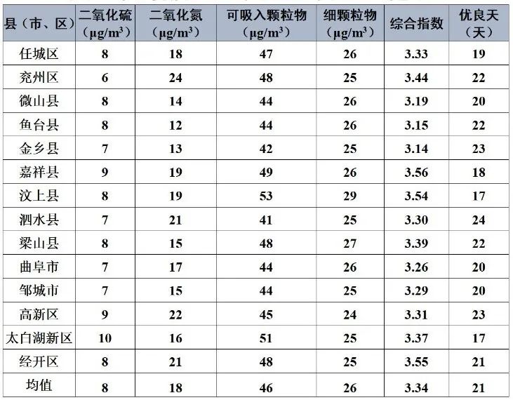 环境空气质量综合指数较好的县(市、区)是金乡县,为3.14;最差的是嘉祥县,为3.56;14县(市、区)同比改善幅度较大的是鱼台县,改善幅度为6.2%,最小的是曲阜市,改善幅度为-6.9%。