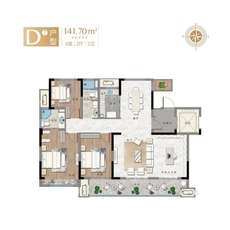 D7户型在空间考量上费尽心思,在不同家庭的不同阶段,给家人提供更多空间功能的可能性。例如,开放式书房的设计巧思,可根据需求改成多功能房、卧室、茶室等空间,实现空间的全龄运用。