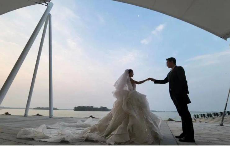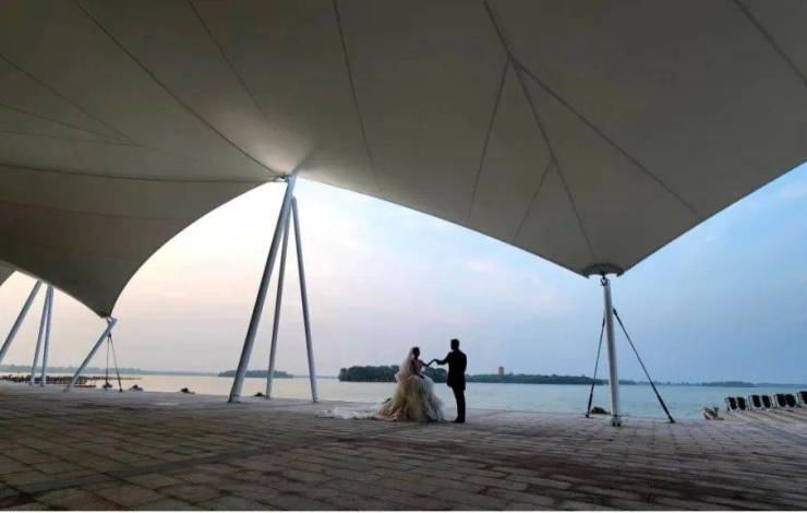 新建成的观景平台张拉膜更加大气壮观,白色明亮耀眼,总长71.883米,最宽18.76米,高达9.9米。结构柱点分为南北各一排,共14个柱点,每排7个,高低间隔,整体成波浪形。张拉膜面积的增大也增加了游客承载容量,是游客休闲漫步观湖赏景的优选位置。