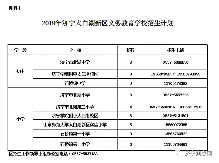 (二)招生计划。见附件1《2019年济宁太白湖新区义务教育学校招生计划》