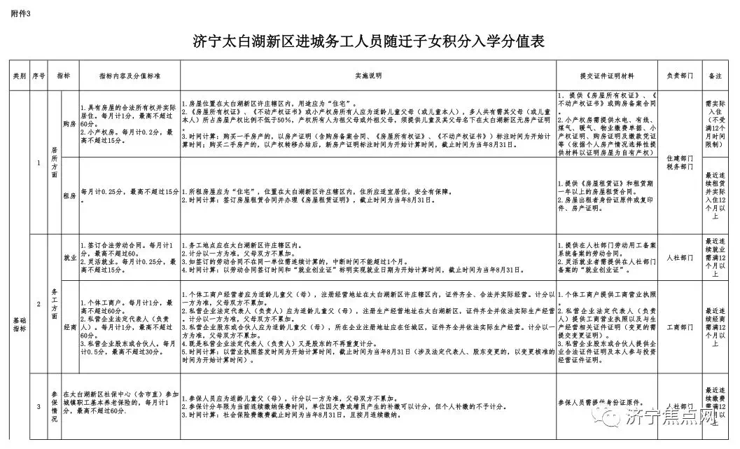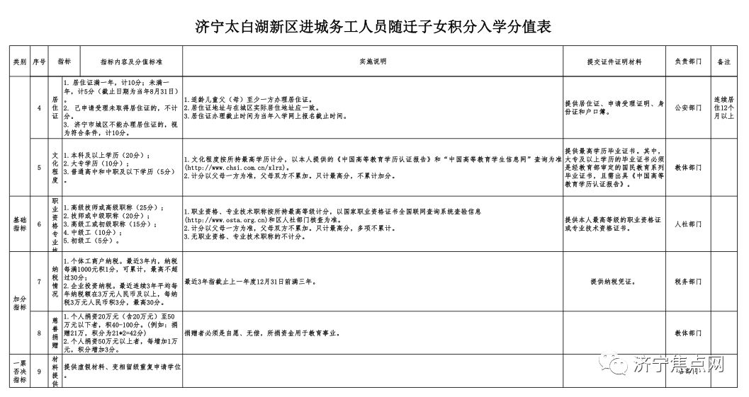 具体积分指标及分值详见《济宁太白湖新区进城务工人员随迁子女积分入学分值表》(附件3)。