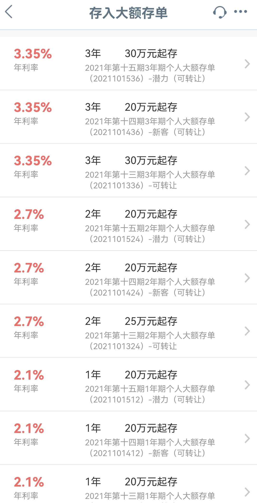 记者21日登陆工商银行手机APP发现,其3年期大额存单利率3.35%,2年期大额存单利率为2.7%,一年期为2.1%,之前高于此利率的产品均已消失。