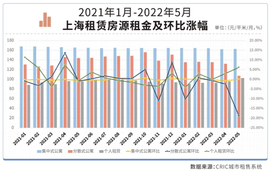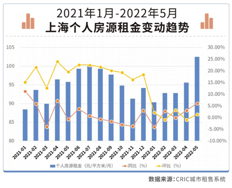 克而瑞租售数据显示,5月,上海个人房源租金为102.51元/平方米/月,排在55城之首,也是少有一个每平米月租金破百元的城市;环比上涨6%,涨幅排在55城前三。4月份,上海个人房源租金环比上涨3%。